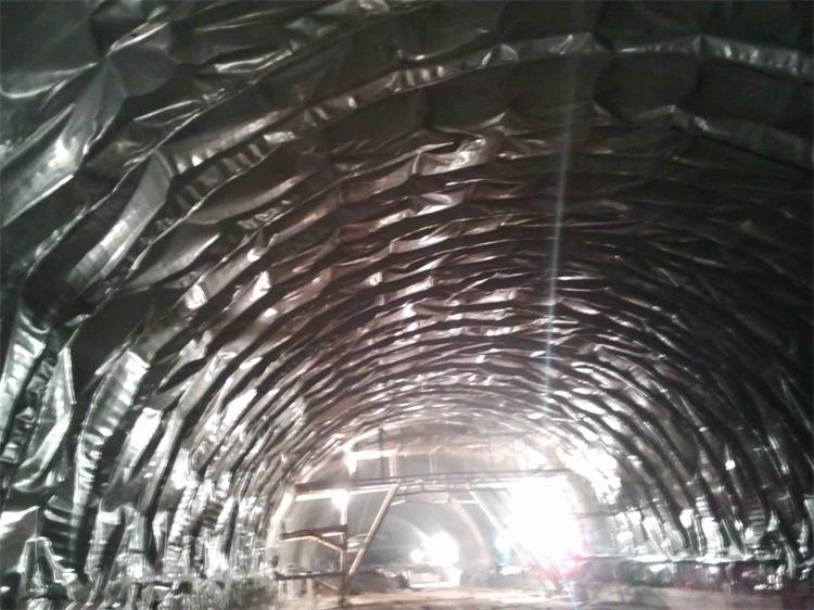四、防水板的鋪設:先在隧道拱頂部的泡沫塑料墊襯上正確標出隧道縱向中心線,再使防水膜的橫向中心線與這一標志重合,將拱頂部與塑料圓墊片熱熔焊接,與泡沫塑料墊襯一樣從拱頂開始向兩側下垂鋪設,邊鋪設與圓墊片熱熔焊接。